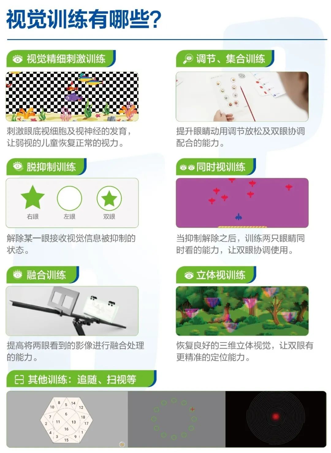 視覺訓(xùn)練是指利用光學(xué)或心理物理學(xué)等方法,訓(xùn)練雙眼調(diào)節(jié)功能、集合功能、眼球運(yùn)動功能以及兩眼的協(xié)調(diào)性,從而提高雙眼視覺系統(tǒng)的應(yīng)用能力,改善視疲勞,眼球運(yùn)動障礙,閱讀障礙等視覺功能障礙。